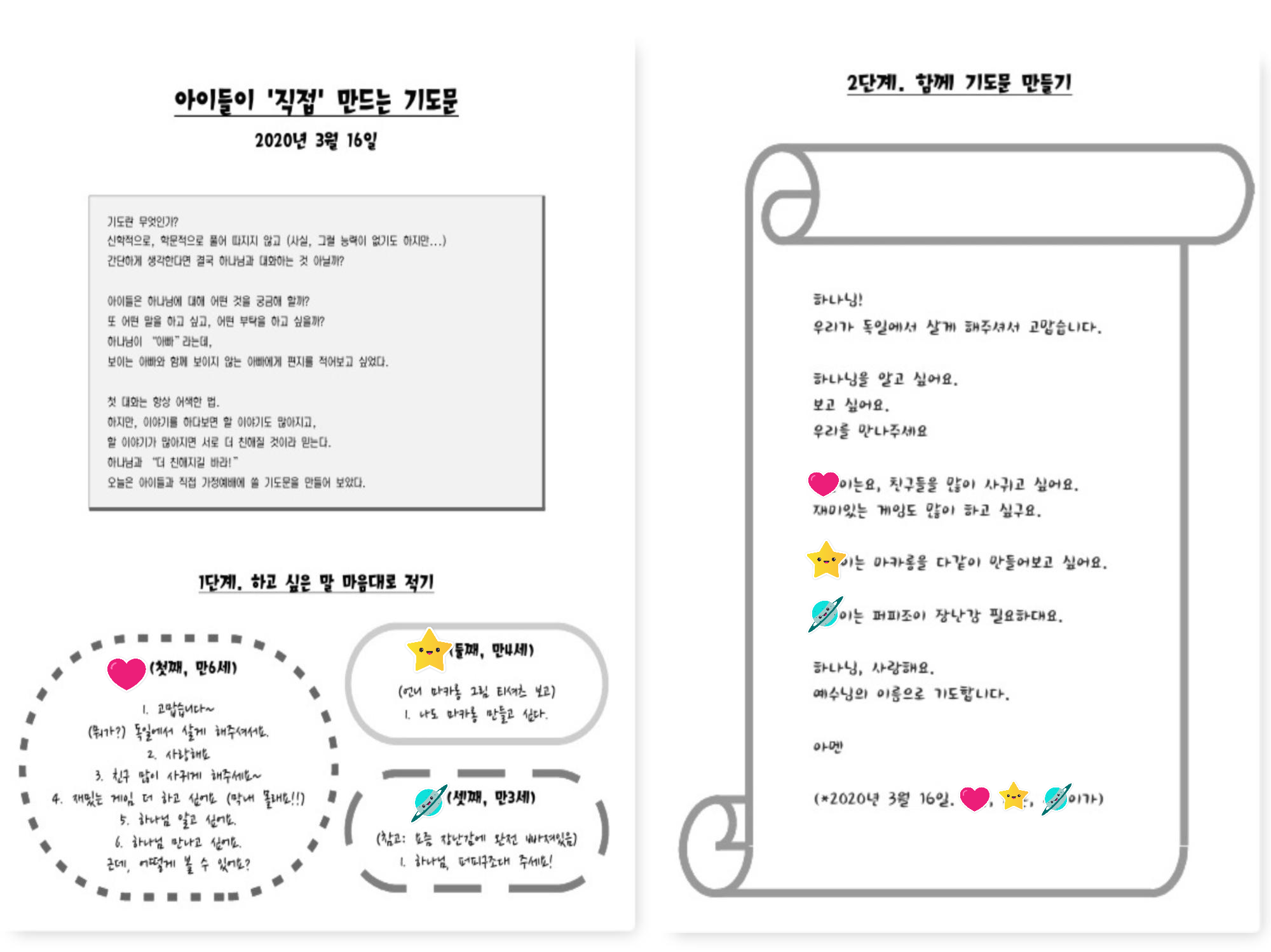 그래서 그냥 아이들과 함께 자기 기도문을 만들어 보자고 생각했다. 일단 한 번 만들어 놓으면, 당장 하나님이 피부에 와 닿진 않더라도 자기 말로 기도할 수 있겠지 싶었다. 그리고 그 기도를 하나님께서 분명 좋아하실 것이라 생각했다. 솔직하고 친밀한 '자신의 말'로 반복되는 아이들의 기도가 실제 삶에서도 실현되는 것을 보면(설령 그 모든 것이 현실이 되진 않더라도) 하나님의 존재가 보다 가까워질 것 같다는 생각이 들었다.