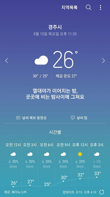 그래서 조금 선선해졌을지도 모르는 날씨가 26~33도이다.