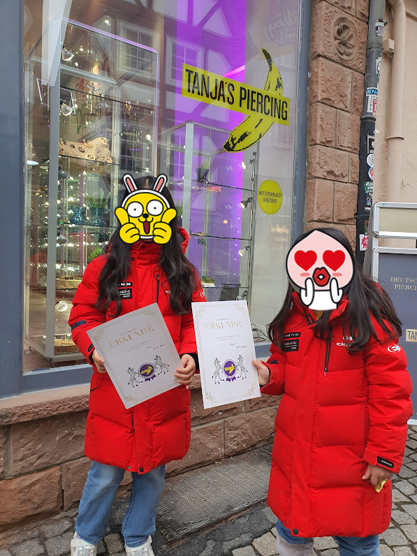 이런 고비를 넘어선 뒤, 다행히 두 녀석 모두 '첫 귀'를 잘 뚫었다. 깔끔하니, 덧나지도 않고, 예쁜 큐빅이 받힌 은으로 도금된 의료용 귀걸이를 하고 웃으면서 밖으로 걸어 나왔다. 애기들 손님이 많아서일까? 매장에서 준비한 '귀 잘 뚫은 증명서(Urkunde)' 상장까지 챙겨받고서 말이다.