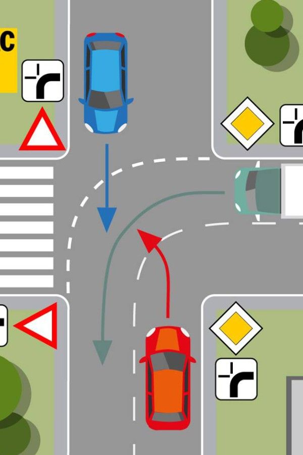 내가 초록색 트럭(2번)을 운전하는 하는 사람이라면? 오른편에서 주행하는 파란색 차량(1번)이 나보다 우선하지만, 좌회전을 하려는 빨간색 차량(3번)은 내 왼편에 있으므로 그보다 내가 우선하여 주행할 수 있다.