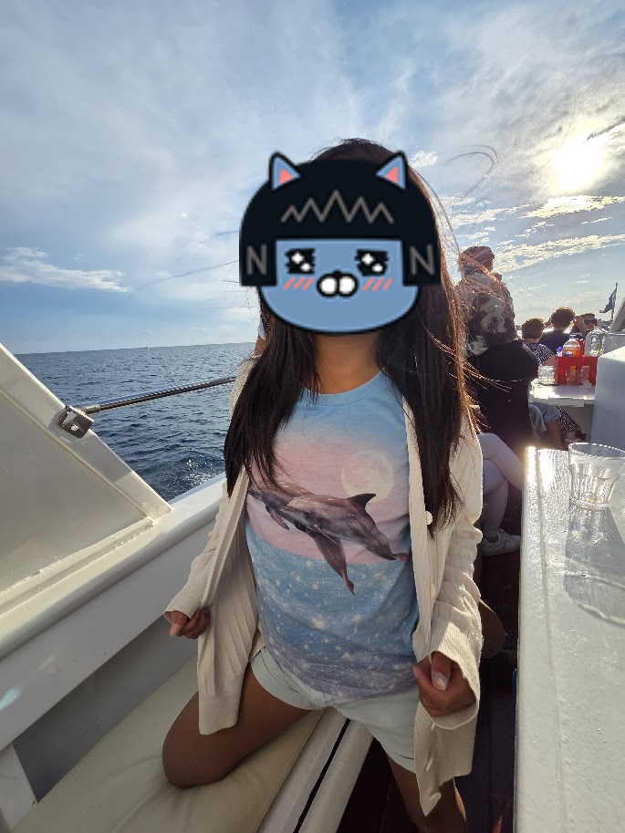 그렇게 저마다의 기대감을 가지고 바다 한 가운데로 나아갔다. 저녁노을이 하늘을 물들이려 황금빛 바다가 펼쳐질 때쯤, 선장의 경적 알림이 들렸다. 이는 미리 우리와 약속한 돌고래가 근처에 있다는 신호였다. 우리 가족은 물론 선상에 자리 잡은 승객들은 누구나 할 것 없이 이리저리 눈을 돌리며 돌고래를 찾기에 여념이 없었다. 그때였다. 첫째가 '저기다! 저기 앞에!'라고 말했다. 우리와 모든 승객들은 첫째가 손가락질하는 쪽으로 먼바다에 눈을 돌렸다. 수면 위로 살짝 드러나는 돌고래의 등이 보였다가 금세 푸른 물결 속으로 몸을 감추었다.